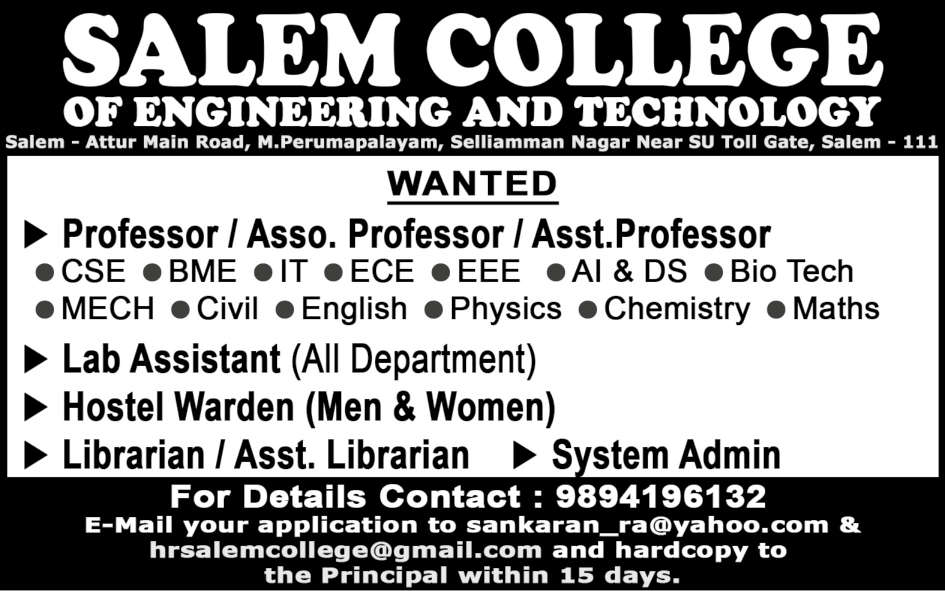 Faculty Recruitment 2025 notification announced by Salem College of Engineering and Technology, Salem – Professor/Associate Professor/Assistant Professor Jobs. Eligible candidates may apply by email and Postal