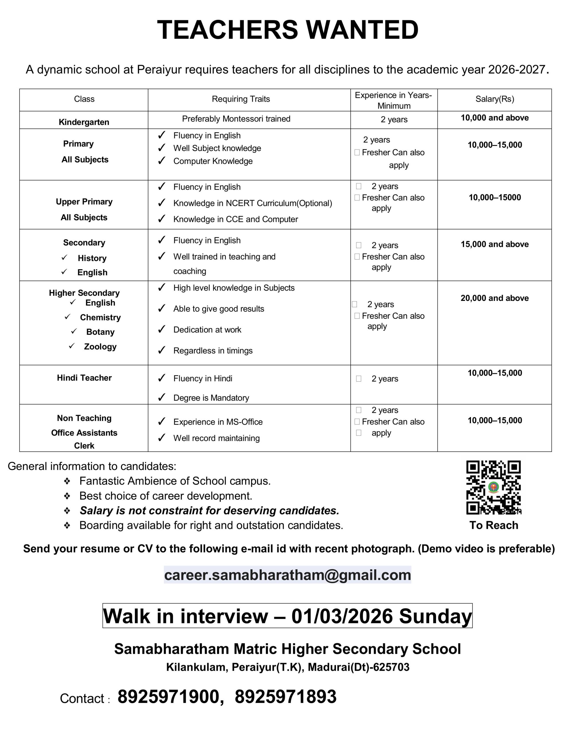 Samabharatham Matric Higher Secondary School, Madurai announced Teacher recruitment for 2026 academic year. Eligible candidates may apply through Email.