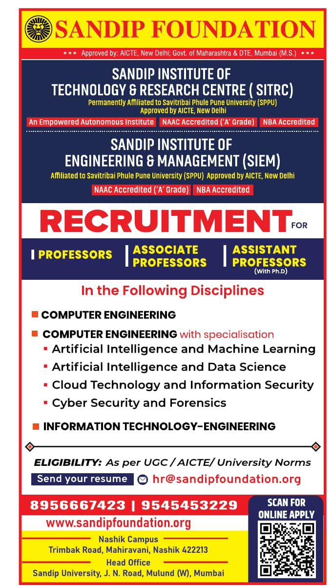 Sandip Foundation, Nashik Wanted Professor/ Associate Professor/ Assistant Professor for the 2025-2026 academic year. Eligible candidates may apply through Email and Online