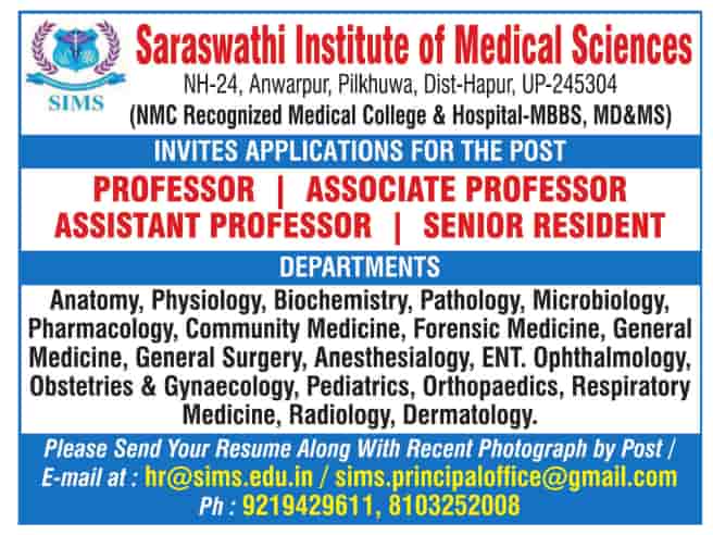 Faculty recruitment Job vacancy notification announced by Saraswathi Institute of Medical Sciences, Hapur for the 2025-2026 academic year. Eligible candidates may apply by email/post