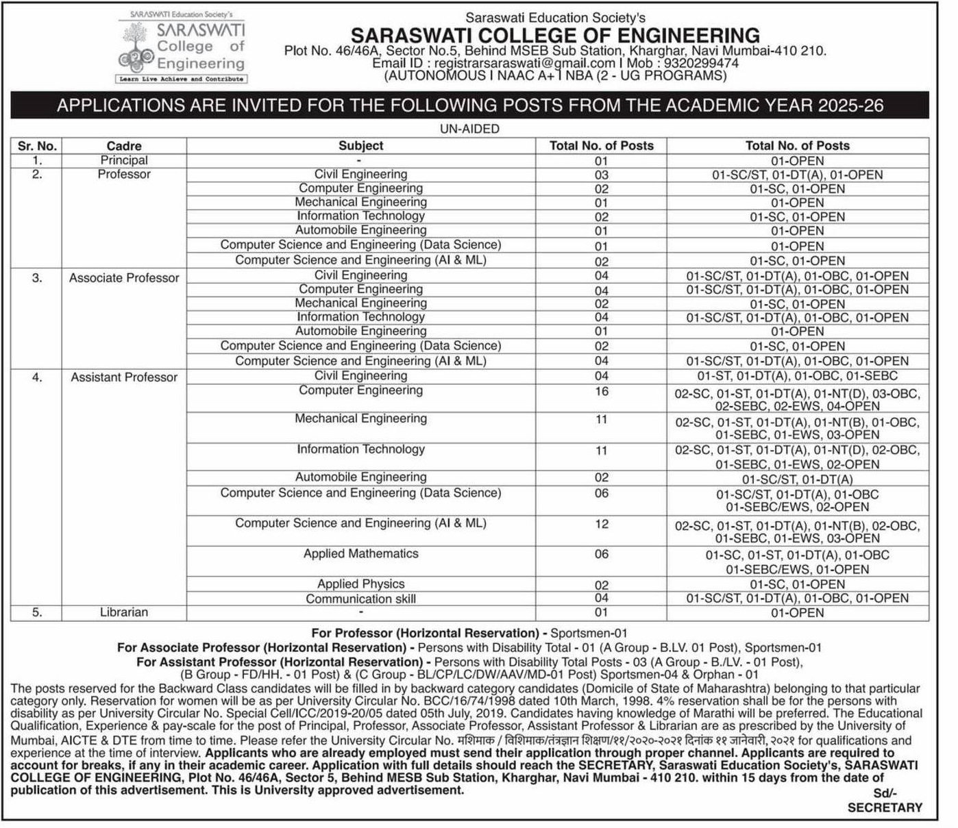 Faculty Recruitment 2025 Job Notification announced by Saraswati college of Engineering, Navi Mumbai for 2025-26 academic year. Eligible candidates may apply through Postal