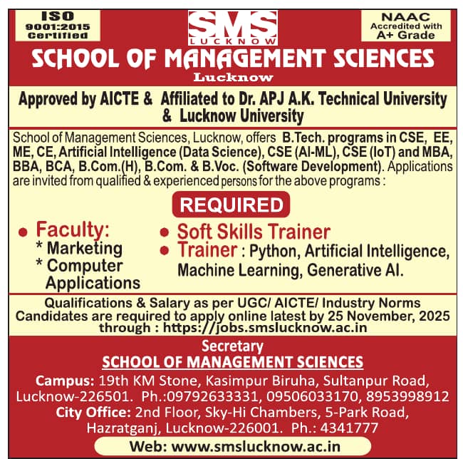 Faculty Recruitment 2025 Job vacancy notification announced by School of Management Science, Lucknow – Professor/ Associate Professor/ Assistant Professor Jobs for the 2025-2026 academic year. Eligible candidates may apply Online.