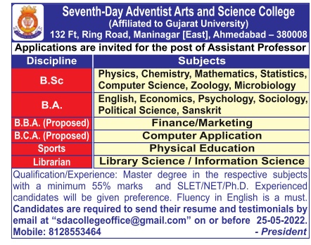 Faculty Recruitment job notification announced by Seventh Day Adventist Arts and Science College, Ahmedabad, Gujarat for the post of Assistant Professor jobs. Interested candidates may apply through email.