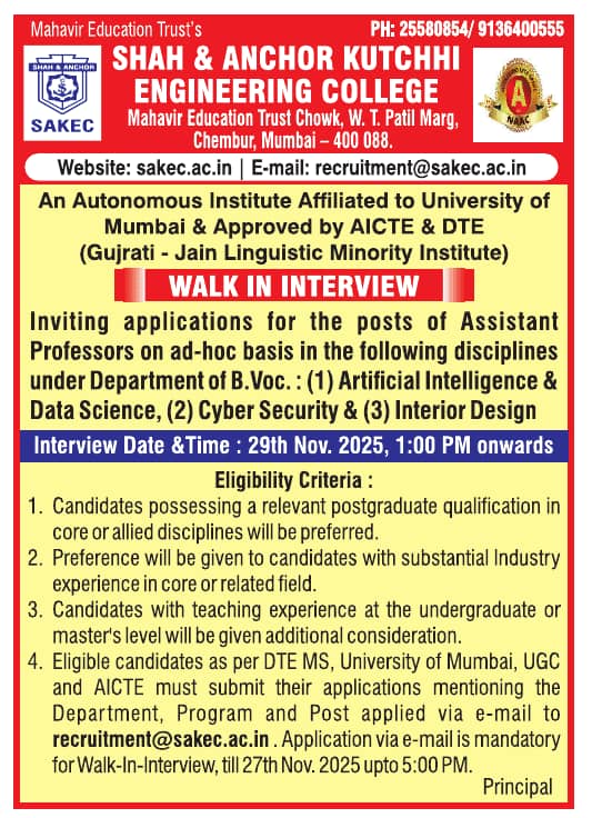 Teaching Jobs vacancy notification announced by Shah and Anchor Kutchhi Engineering College, Mumbai, Maharashtra for the 2025-2026 academic year. Eligible candidates may apply through Email.