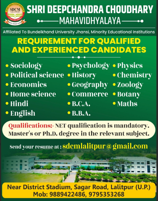 Faculty Recruitment 2025 job notification announced by Shree Deepchandra Chaudhary Mahavidhyalaya Lalitpur, Uttar Pradesh for 2025-2026 academic year. Eligible candidates may apply through Email.