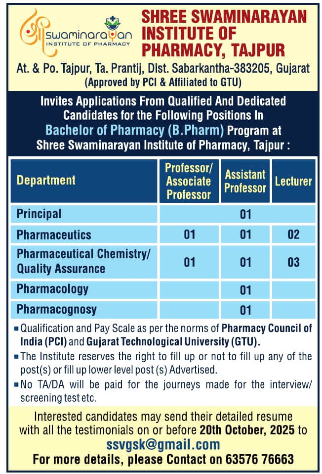 Teaching Faculty Jobs vacancy notification announced by Shree Swaminarayan Institute of Pharmacy, Tajpur for 2025-2026 academic calendar year. Eligible candidates may apply through Email
