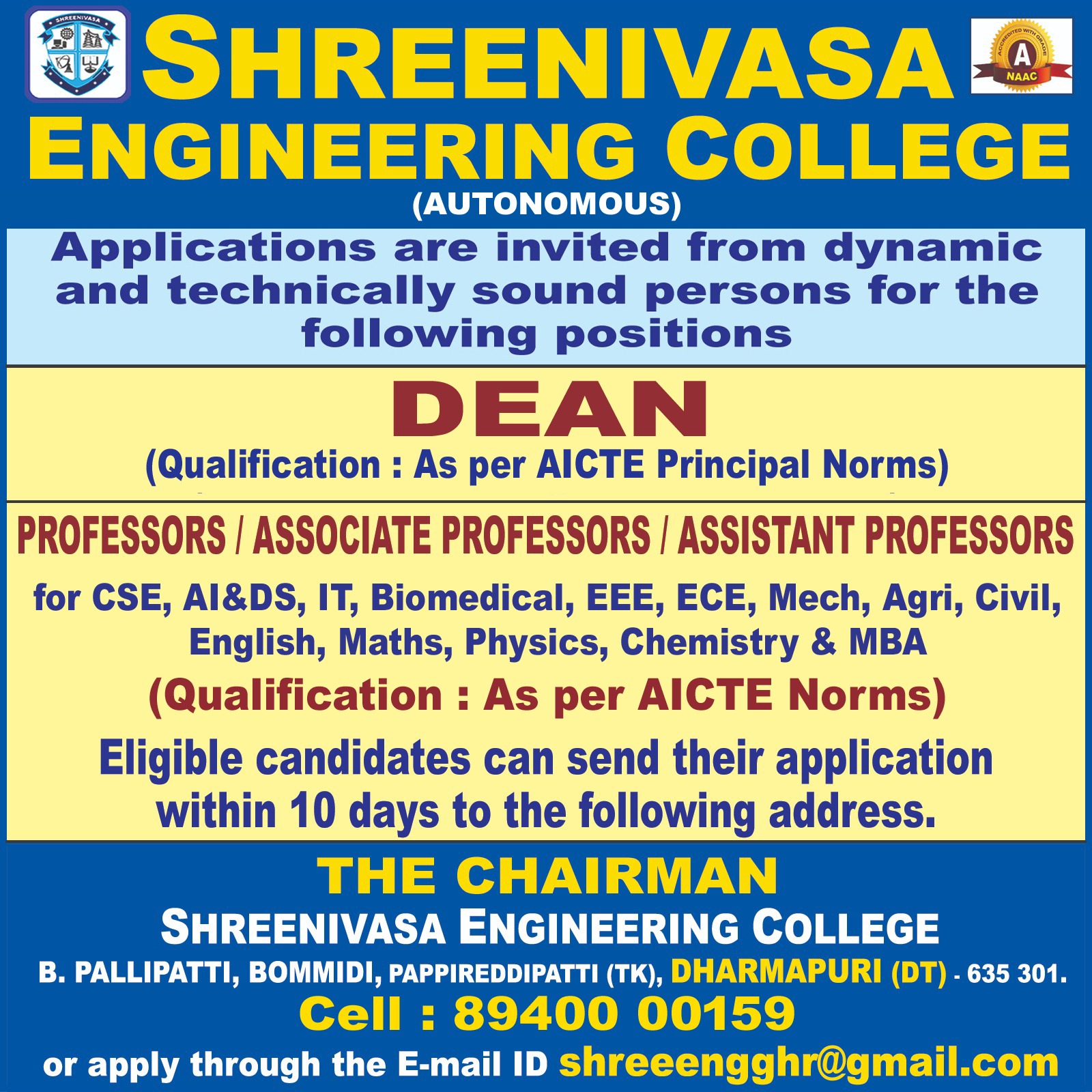 Shreenivasa Engineering College, Dharmapuri has announced a new recruitment notification inviting applications from qualified and dynamic professionals for senior academic and faculty roles. The institution is seeking experienced candidates for Dean positions, along with Professors, Associate Professors, and Assistant Professors across multiple engineering and science disciplines. This is an excellent opportunity for candidates aiming to work in an autonomous institution with NAAC accreditation. Applicants who meet AICTE norms and are passionate about teaching, research, and academic leadership are encouraged to apply within the specified time frame.