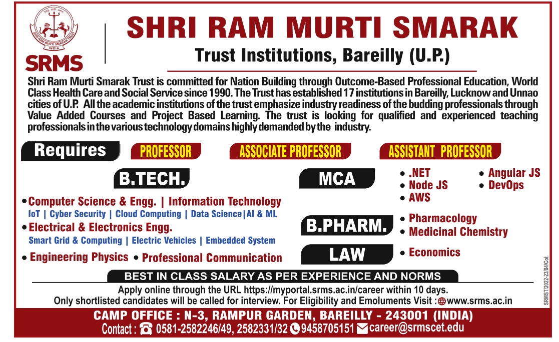 Shri Ram Murti Smarak College Trust Institutions, Bareilly, Wanted Professor, Associate Professor, Assistant Professor