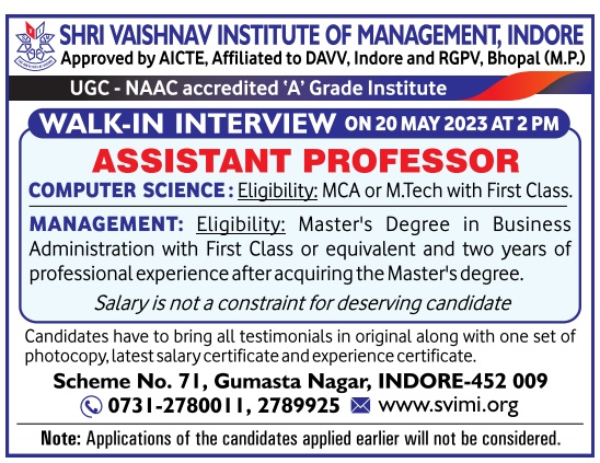 Teaching Jobs vacancy notification announced by Shri Vaishnav Institute of Management, Indore for the 2022-2023 academic year. Eligible candidates may apply within 15 days through Postalwalkin on 20th May 2023.