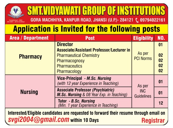 Faculty Recruitment job notification announced by Smt. Vidyawati Group of Institutions, Jhansi for the post of Director, Associate Professor/ Assistant Professor, Lecturer, Vice-Principal, Tutor Jobs. Eligible candidates may apply by email.