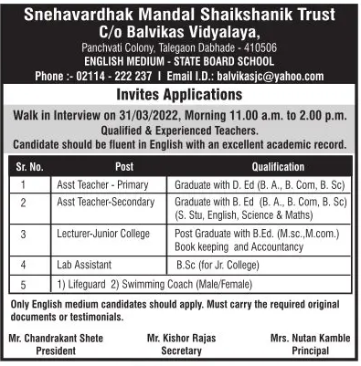 Faculty recruitment 2022 Job vacancy notification announced by the Snehavardhak Mandal Shaikshanik Trust -Talegaon Dabhade Jobs for 2022- 2023 academic year. Eligible candidates may apply by post.