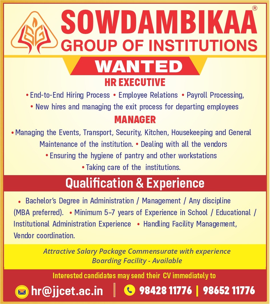 Sowdambikaa Group of Institutions recruitment 2026, HR Executive jobs, Manager jobs in educational institutions, administration jobs in Tamil Nadu, facility management and payroll processing jobs, school administration careers, MBA preferred jobs in education sector.