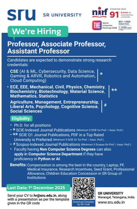 Faculty Recruitment 2025 notification announced by the SR University, Warangal – Professors/ Associate Professors and Assistant Professors Jobs. Eligible candidates may apply apply through Email