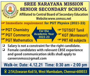 Teaching and Non-Teaching Faculty recruitment 2021 Job vacancy notification announced by Sree Narayana Mission Senior Secondary School, Chennai for the post of PGT/TGT/SGT/KGT/PRT Teachers for the 2021-2022 academic year. Eligible candidates may apply by email and Walkin on 4th December 2021 from 8.30 am to 2.00 pm.