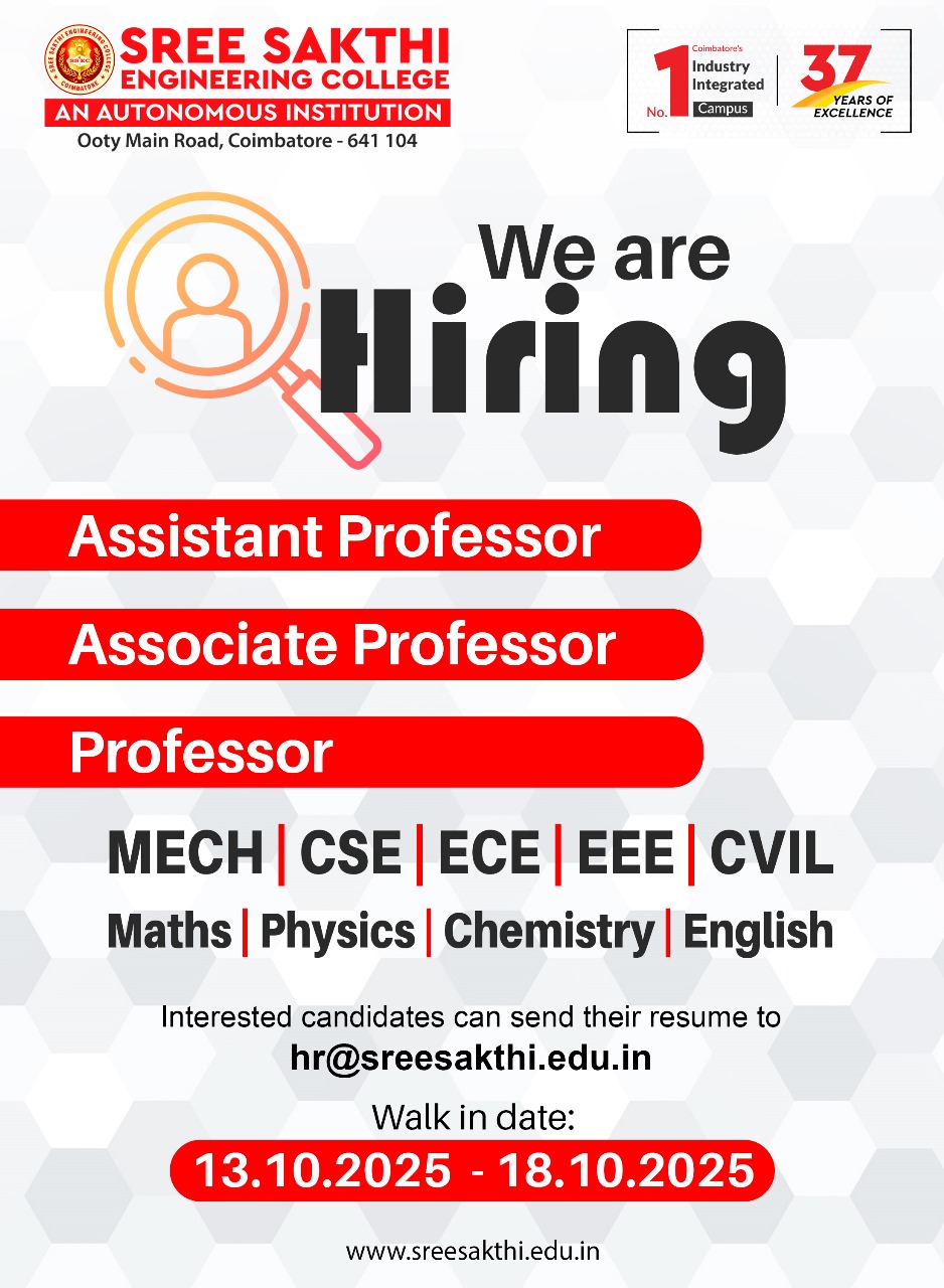 Faculty Recruitment 2025 notification announced by Sree Sakthi Engineering College, Karamadai, Coimbatore, Tamilnadu – Faculty Jobs. Eligible candidates may apply through Email.