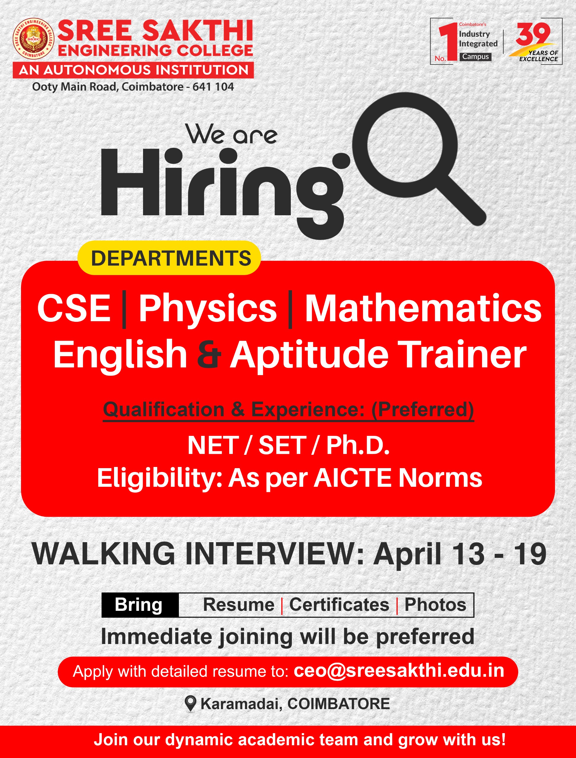 Sree Sakthi Engineering College, Coimbatore has announced faculty recruitment 2026 through a walk-in interview for various teaching positions. The institution is inviting qualified and passionate candidates in disciplines such as Computer Science, Physics, Mathematics, and English along with Aptitude Training. Candidates with strong academic credentials and a commitment to teaching excellence are encouraged to attend the interview. This is an excellent opportunity for aspiring academicians seeking immediate placement in a reputed autonomous engineering college. Immediate joiners will be given preference.
