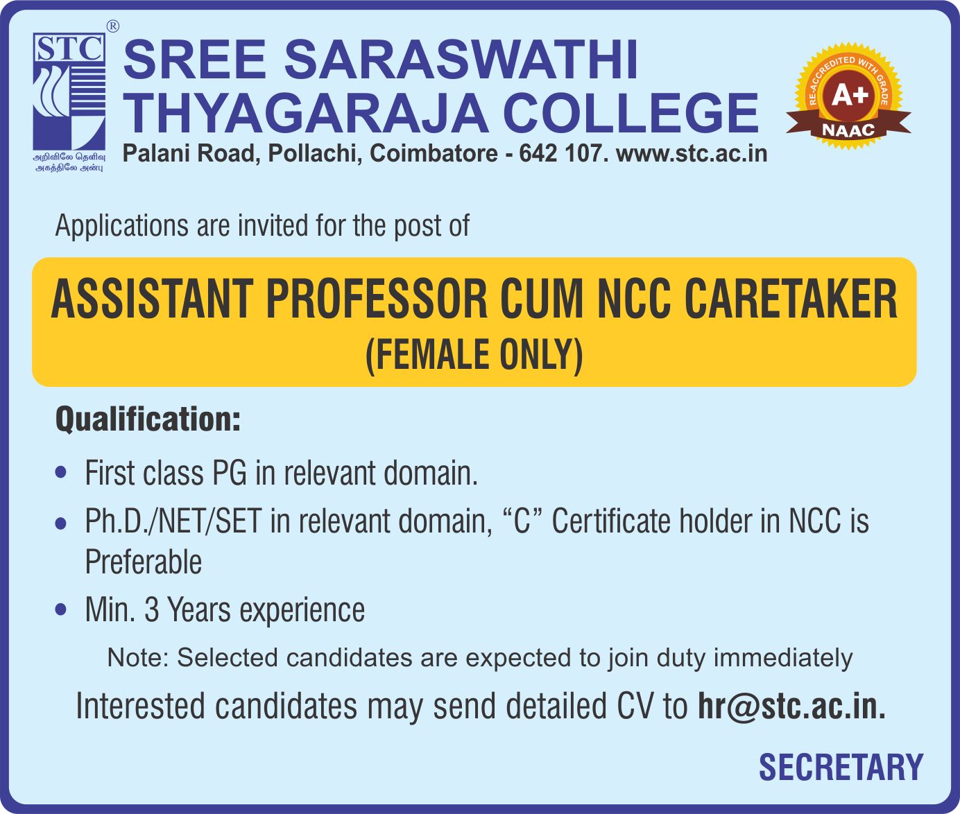 Faculty Recruitment 2025 job notification announced by Sree Saraswathi Thyagaraja College, Pollachi, Coimbatore, Tamilnadu for 2025-2026 academic year. Eligible candidates may apply through Email .