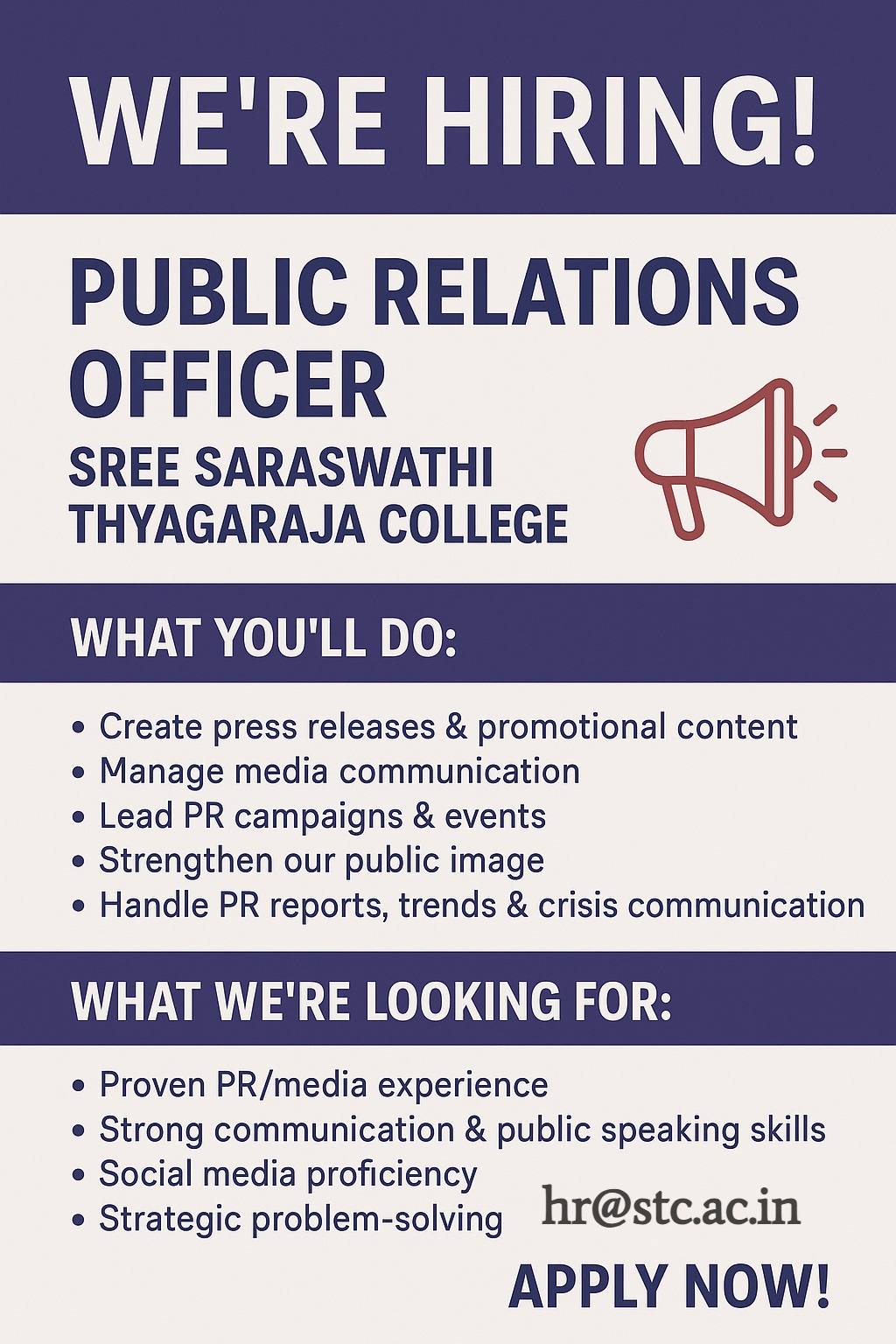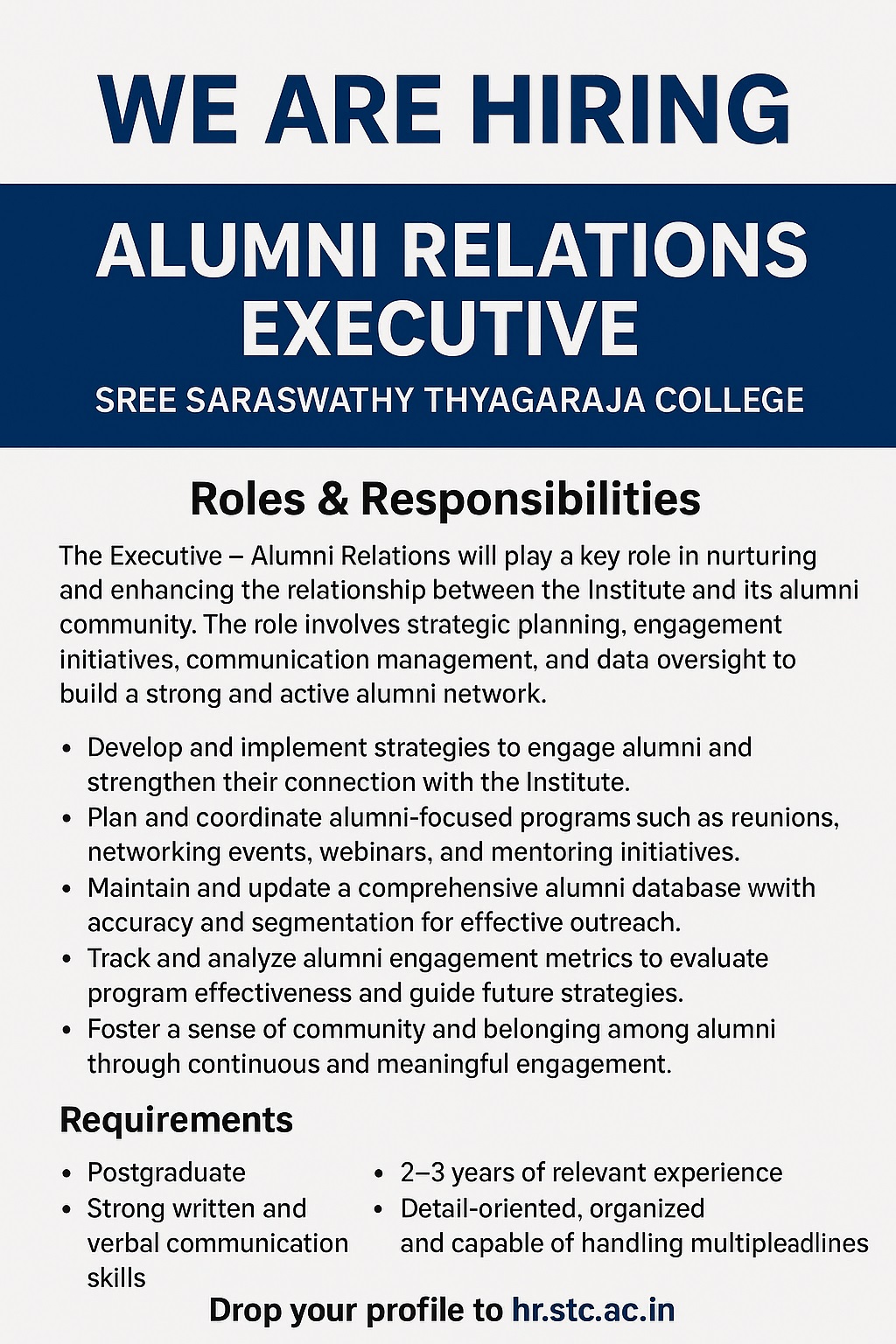 Sree Saraswathi Thyagaraja College, Pollachi, Tamilnadu Advertised for the Non-Faculty recruitment 2025- 2026 academic year – Telecalling Executive, Public Relation Officer, Alumni Relations Executive Job. Eligible candidates may apply by email.