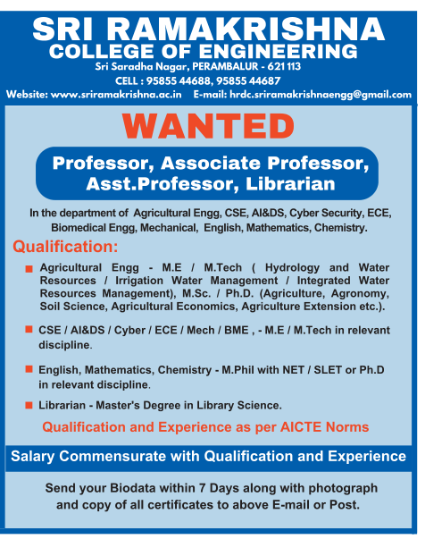 Organization Profile: Sri Ramakrishna College of Engineering, Perambalur is a unit of Sri Swamy Vivekananda Educational Trust. The Trust was founded by Dr.M.Sivasubramaniam and Founder Chairman of Sri Ramakrishna Educational Institutions. The college is approved by AICTE and is affiliated to the Anna University, Chennai. The college was established in the year 2012.