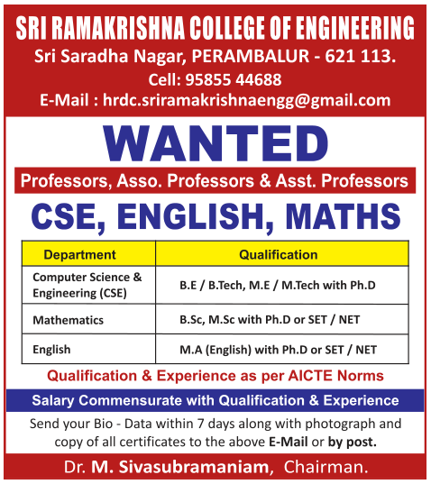Faculty Recruitment 2025 job notification announced by Sri Ramakrishna College of Engineering, Perambalur Tamil Nadu for the 2025-2026 academic year. Eligible candidates may apply through Email or Postal