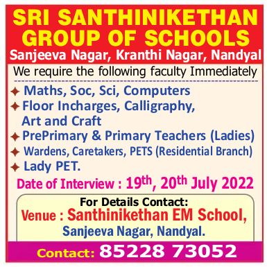 Teaching and Non-Teaching Faculty Recruitment job notification announced by Sri Santhinikethan Group of Schools, Nandyal for the post of Teachers, Wardens, Caretakers, and PET Teachers jobs. Interested candidates may appear for a walk-in interview.
