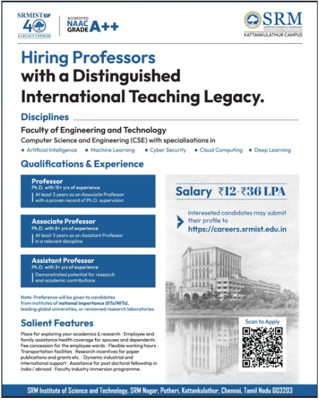 Faculty Recruitment 2026 job notification announced by SRM Institute of Science and Technology, SRM Nagar, Potheri, Kattankulathur, Tamil Nadu, for the Academic Year 2025-2026. Eligible candidates may apply through Email.