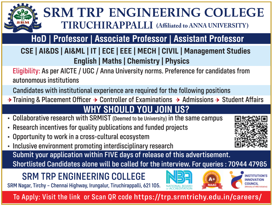 Professor/ Associate Professor/ Assistant Professor Recruitment 2025 Job vacancy notification announced by SRM TRP Engineering College, Trichy, Tamilnadu for the 2025-2026 academic year. Eligible candidates may apply Online