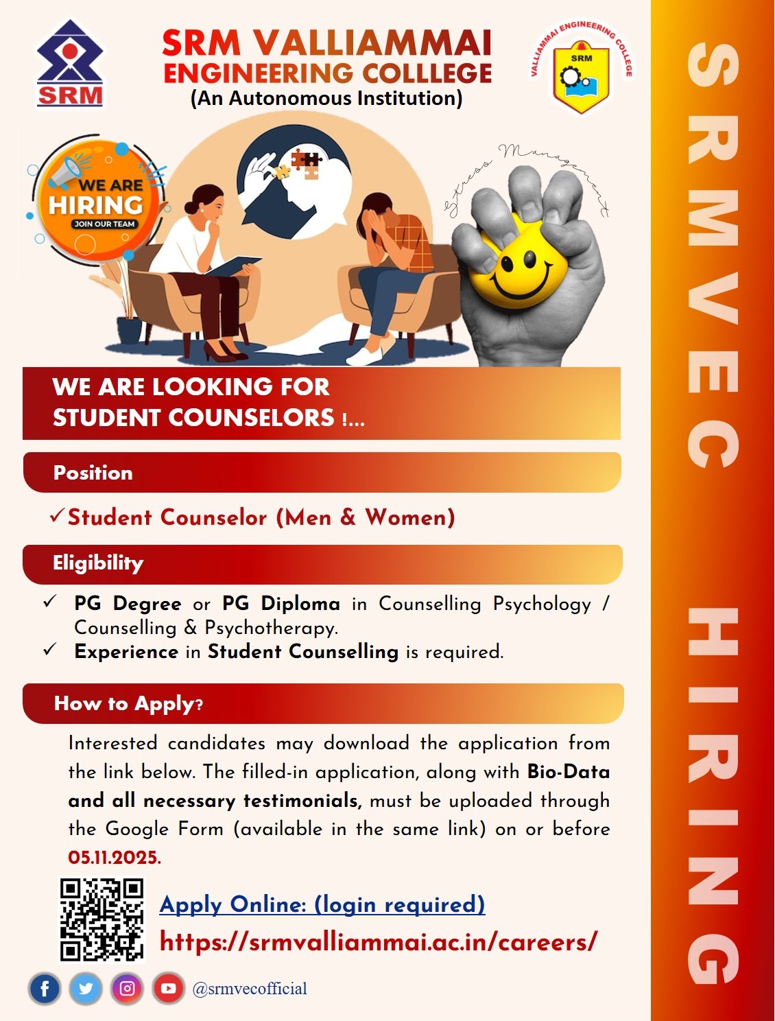 SRM Valliammai Engineering College, Chengalpattu Wanted Student Counsellor