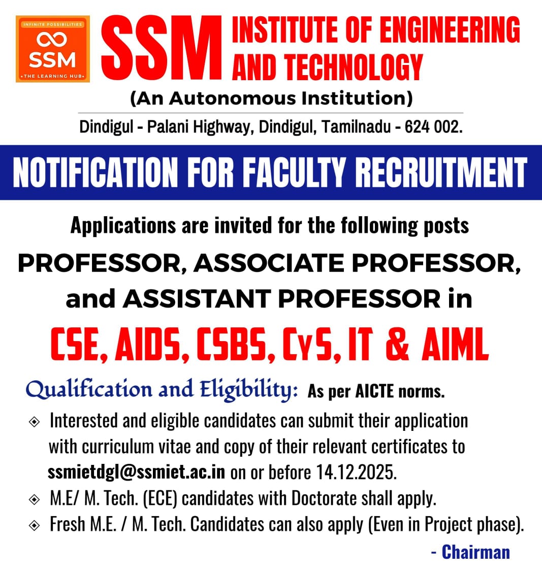 Faculty Recruitment 2026-2027 job notification announced by SSM INSTITUTE OF ENGINEERING AND TECHNOLOGY (Autonomous), Dindigul, Tamil Nadu for 2026-2027 academic year. Eligible candidates may apply through Email.