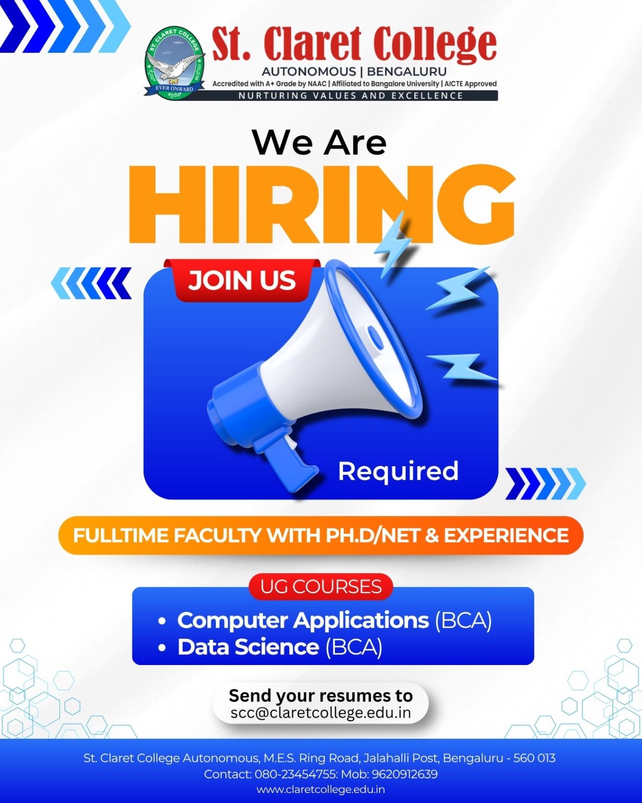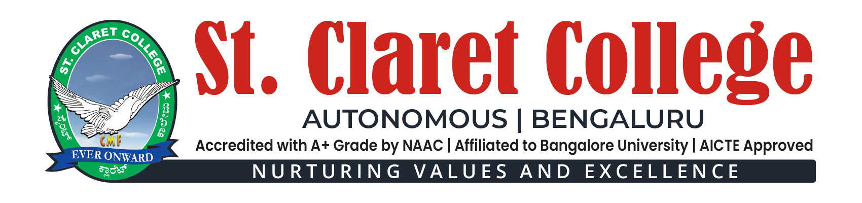 Organization Profile: St. Claret College, Autonomous Bengaluru (SCC) (URL: www.claretcollege.edu.in ) was established in 2005 by the international Missionary Congregation of Claretians who manage two universities and over 150 educational institutions in 66 countries around the world. The Bengaluru campus is managed by Claretian educational society established with the aim of providing holistic and quality education to the people in and around North Bangalore. St. Claret College offers value based education to transform students to be enlightened leaders and networkers who bring about a civilization of love and harmony. St. Claret College is recognized by UGC and permanently affiliated to Bangalore University. St Claret College is accredited by NAAC with A+ grade.