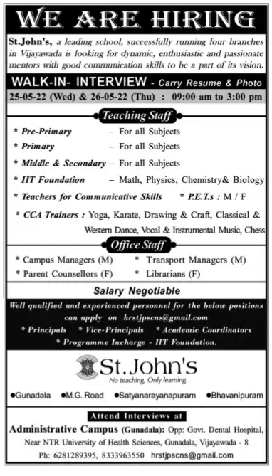 Faculty Recruitment job notification announced by St.John’s School, Vijayawada, Andhra Pradesh for the post of Pre Primary, Primary, Middle and Secondary Teachers, Office staff Jobs. Eligible candidates may appear walk-in interview.