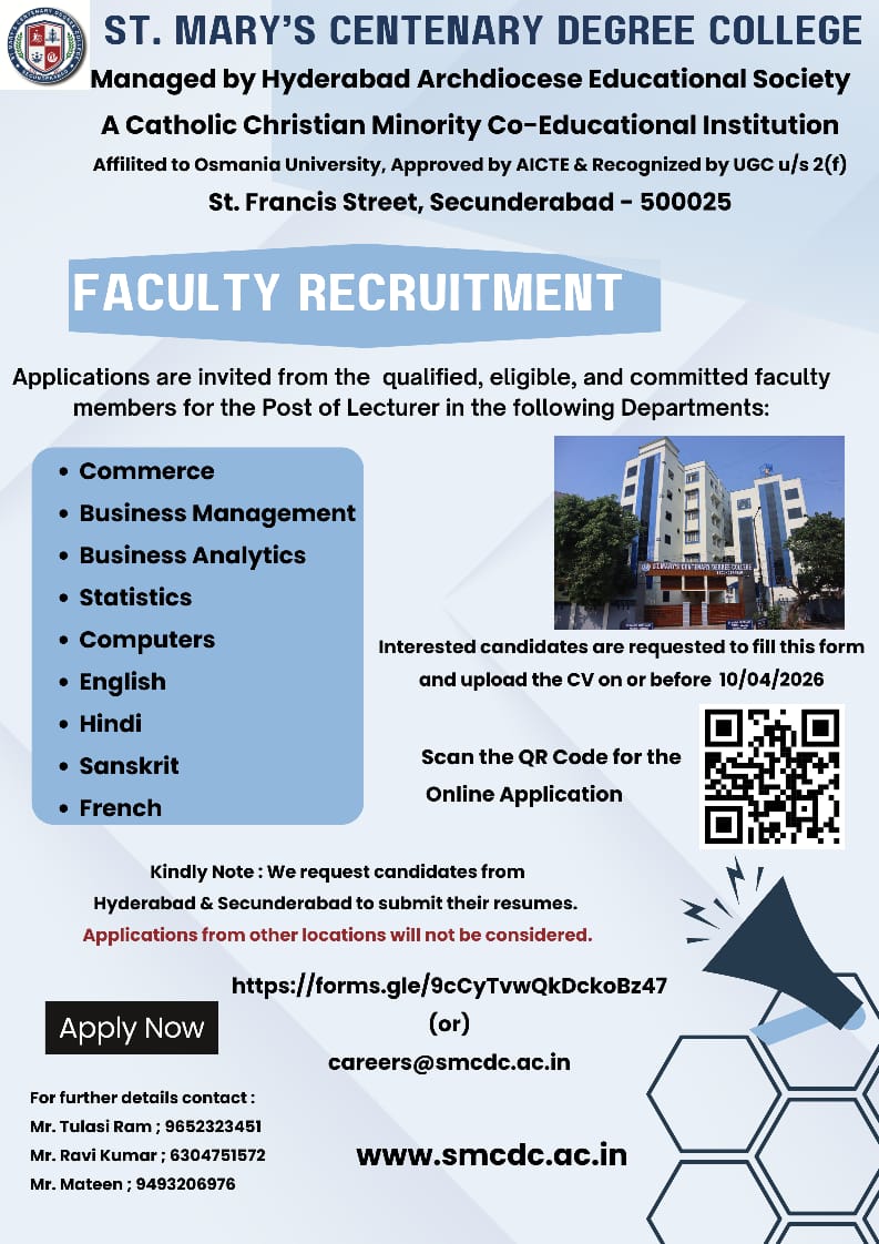 St. Mary’s Centenary Degree College, Secunderabad | Faculty Openings 2026