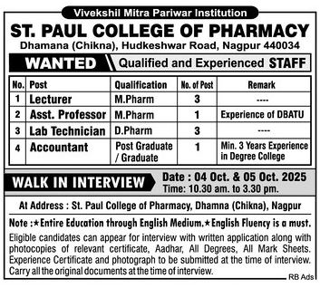 Faculty Recruitment 2025 job notification announced by St Paul College of Pharmacy, Nagpur for the 2025-2026 academic year. Eligible candidates may Walk-In