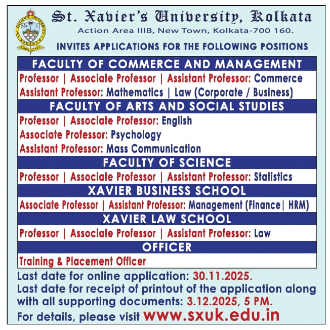 Faculty recruitment notification announced by St. Xavier’s University, Kolkata Wanted Assistant Professor, Associate Professor and Professor for the 2025-2026 academic calendar year. Eligible candidates may apply through Online and Postal.