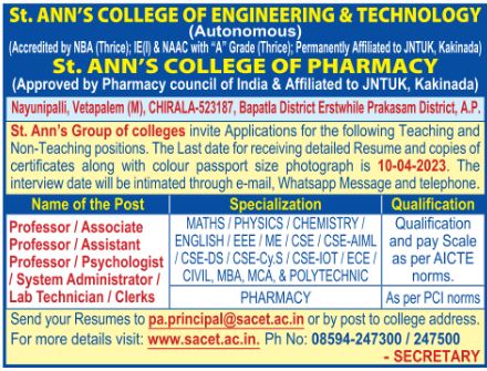 Teaching Faculty recruitment 2023 Job vacancy notification announced by St. Ann’s College of Engineering and Technology, Prakasam , Andhra Pradesh for 2023 academic year. Eligible candidates may apply through Email or Postal