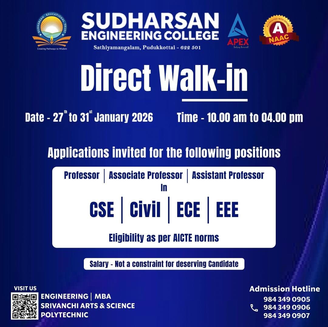 Sudharsan Engineering College faculty recruitment 2026, walk in interview in Pudukkottai, Professor, Associate Professor, Assistant Professor jobs, CSE, Civil, ECE, EEE teaching vacancies, engineering college jobs Tamil Nadu.