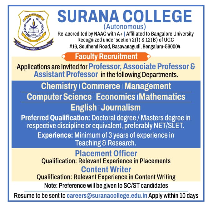Faculty Recruitment 2025 Job vacancy notification announced by Surana College for the 2025-2026 academic year for the post of Professor/ Associate Professor/ Assistant Professor. Eligible candidates may apply by email.