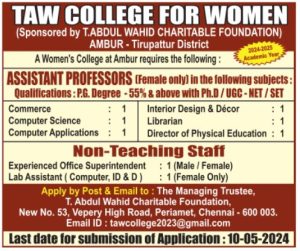Faculty Recruitment 2024 job notification announced by TAW College for Women, Tirupattur, Tamilnadu for the 2024-2025 academic year. Eligible candidates may apply through Email/ Postal.