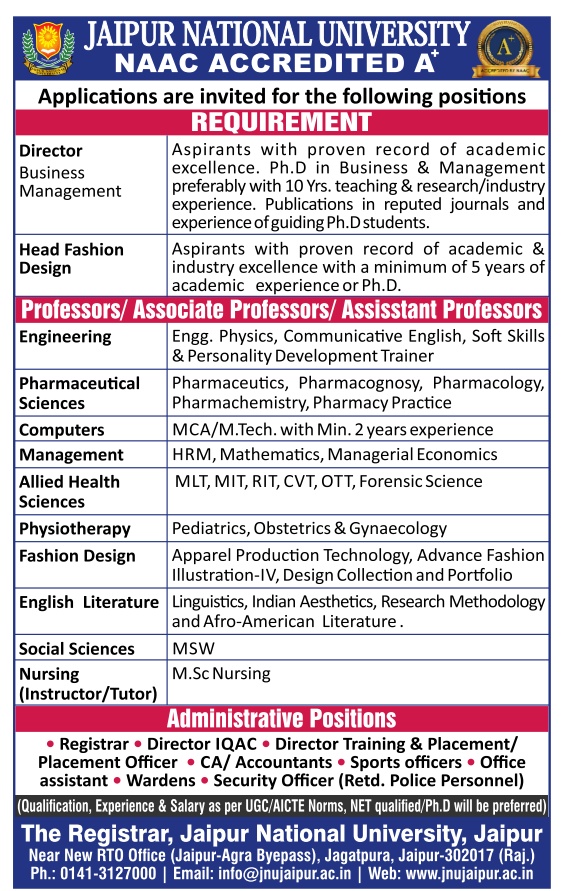 Faculty Recruitment notification announced by Jaipur National University, Jaipur – Teaching and Non-Teaching Faculty jobs. Eligible candidates may apply by postal and Email