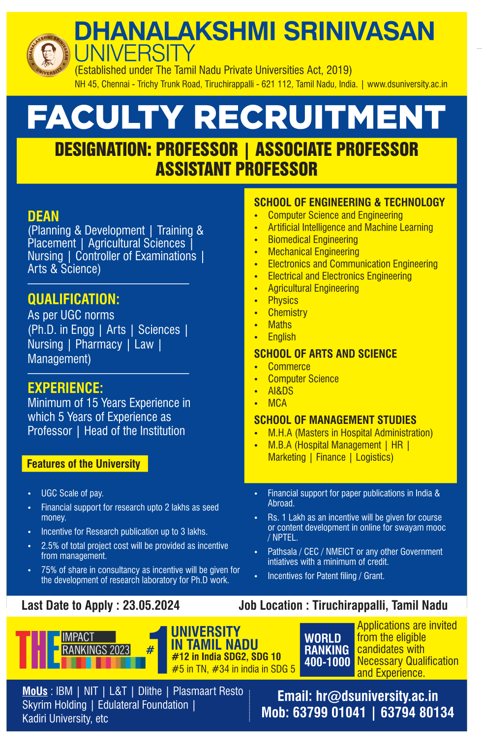 Faculty recruitment notification announced by Dhanalakshmi Srinivasan University, Tiruchirapalli for the post of Dean, Professor/ Associate Professor/ Assistant Professor jobs. Eligible candidates may apply through Email.