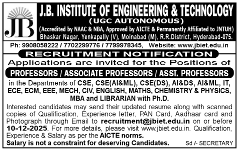 J.B Institute of Engineering and Technology, Hyderabad, Telangana Wanted Professor, Associate Professor, and Assistant Professor for the 2025-2026 academic year. Eligible candidates may apply through Email.