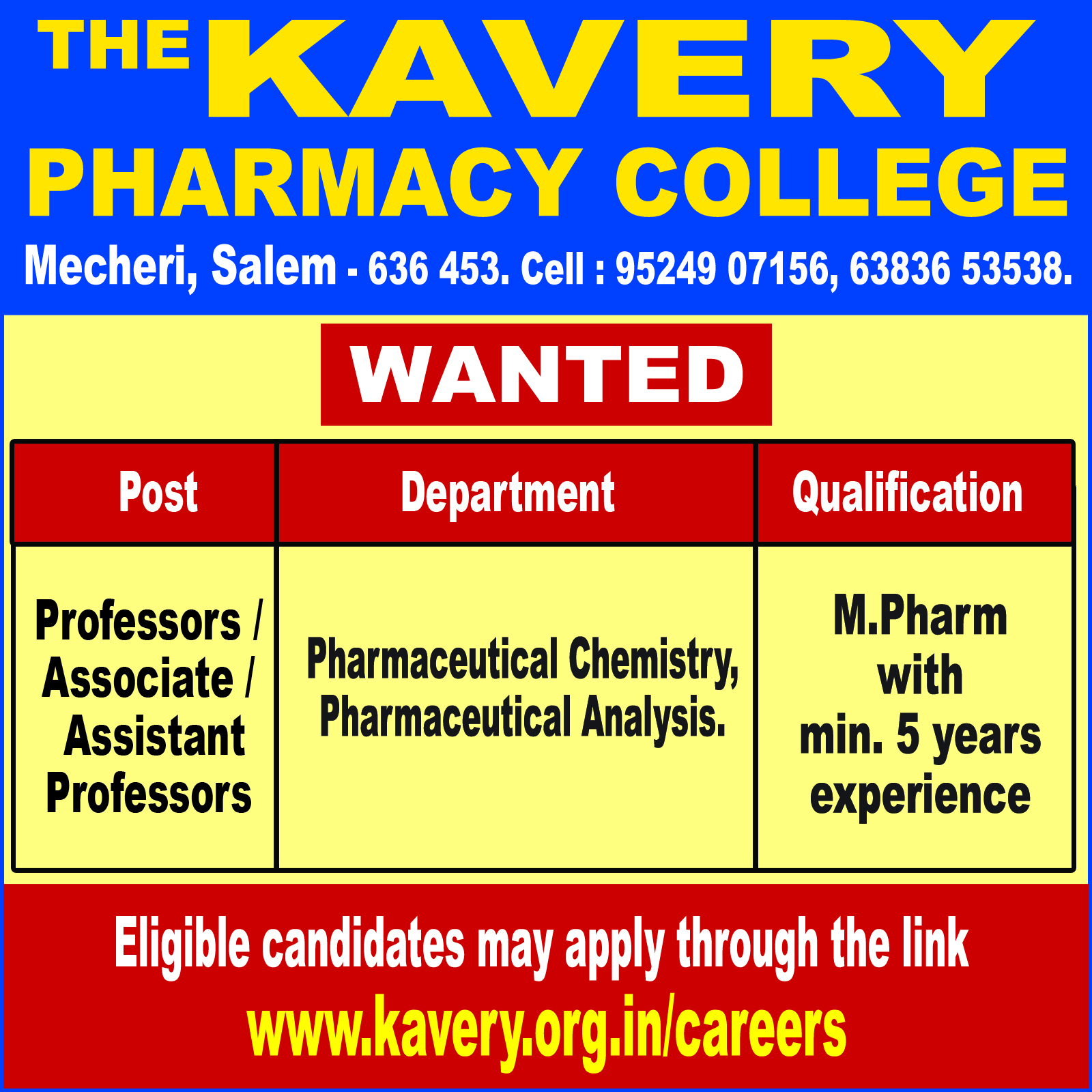 The Kavery Pharmacy College, Salem has announced Teaching faculty jobs in 2024 for the post of Assistant Professor, Associate Professor Jobs. Interested candidates may apply Online immediately.