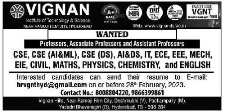 Faculty Recruitment 2023 job notification announced by Vignan Institute of Technology and Science, Hyderabad, Telangana for the 2023-2024 academic year. Eligible candidates may appear for walk-in interview on 3rd December 2023.