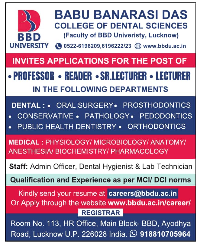 Teaching and Non-Teaching Jobs vacancy notification announced by Babu Banarasi Das College of Dental Sciences, Lucknow, Uttar Pradesh for 2025-2026 academic calendar year. Eligible candidates may apply through Email or Online