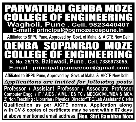 Faculty Recruitment job notification announced by Parvatibai Genba Moze College of Engineering, Pune, Maharashtra for the post of Professor, Associate Professor, Assistant Professor, Non-Teaching Jobs. Eligible candidates may apply within 7 days through Email.