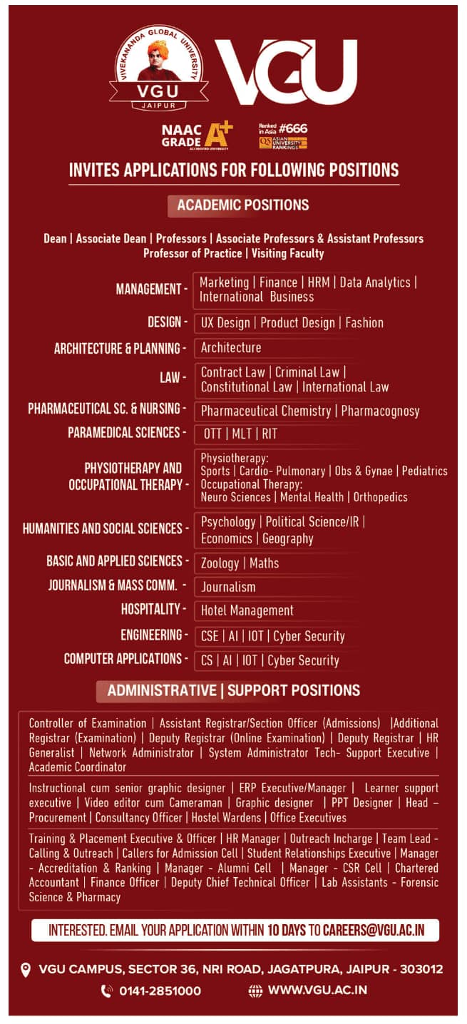 Teaching and Non-Teaching Jobs vacancy notification announced by Vivekananda Global University, Jaipur, Rajasthan for 2025-2026 academic calendar year. Eligible candidates may apply through Email.
