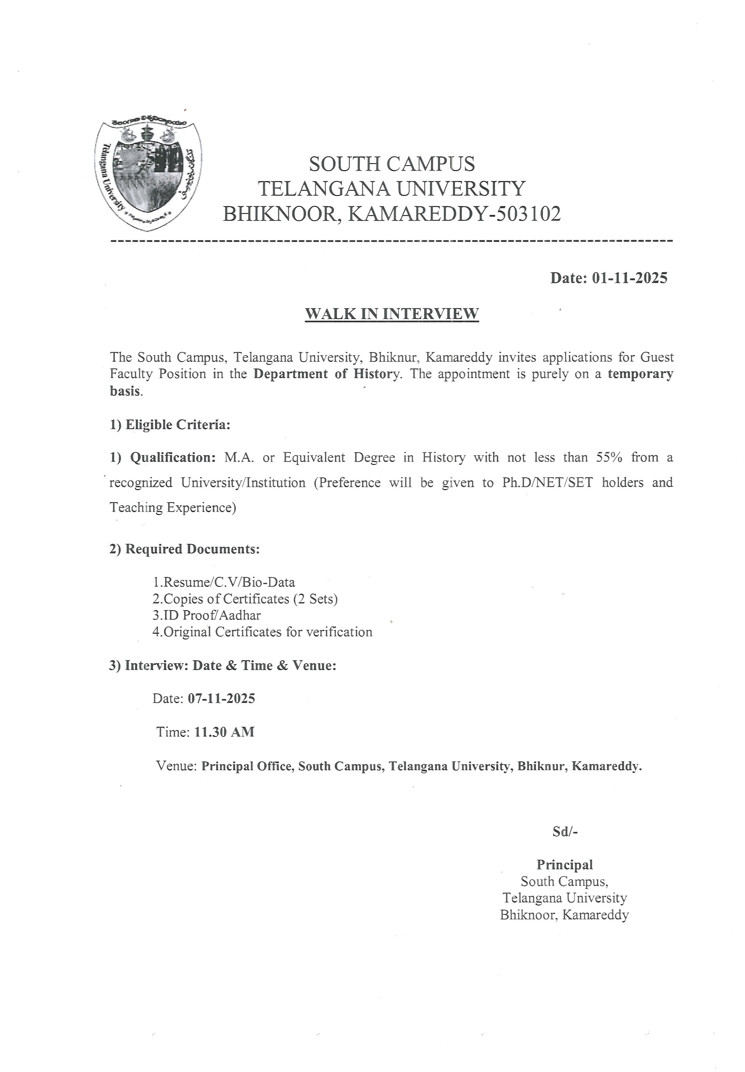Teaching Jobs vacancy notification announced by Telangana University, Kamareddy wanted Guest Faculty for 2025-2026 academic year . For More Details see below