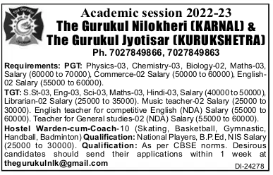 Teaching Faculty Recruitment notification announced by The Gurukul Nilokheri, The Gurukul Jyotisar, Kurukshetra – PGT, TGT, Hostel Warden. Eligible candidates may apply by Email.