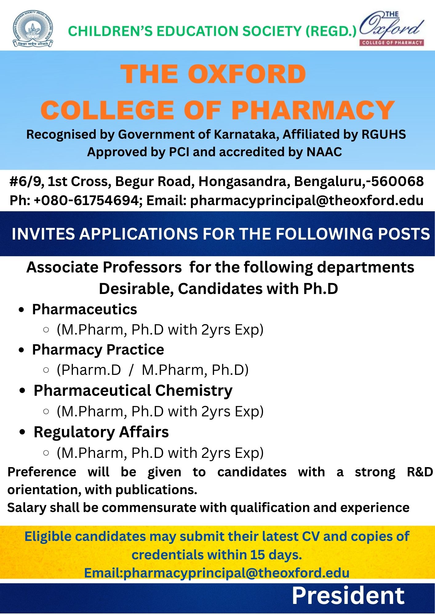 Hiring Organization: THE OXFORD COLLEGE OF PHARMACY 6/9, 1ST MAIN, BEGUR ROAD, HONGASANDRA, BENGALURU-560 068