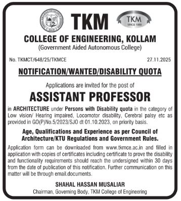 Faculty recruitment 2025 vacancy notification announced by TKM College of Engineering, Kollam, Kerala for the 2025-2026 academic calendar year. Eligible candidates may apply within 30 days.